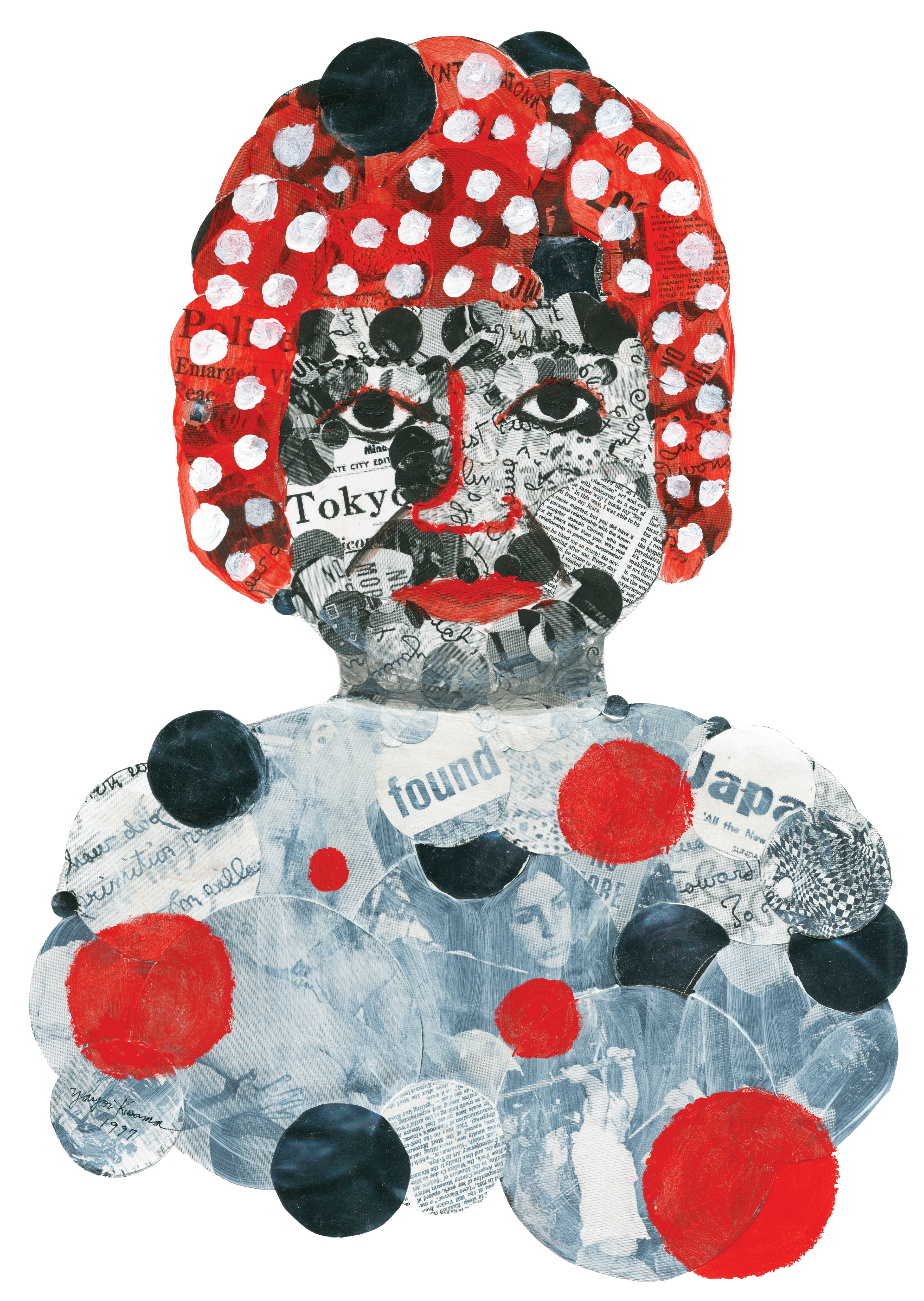 Yayoi Kusama's portrait is made of cut circles of items that represent herself as an artist and a woman. Her details are drawn over with red pastel, black and white paint, and reflective sticker.