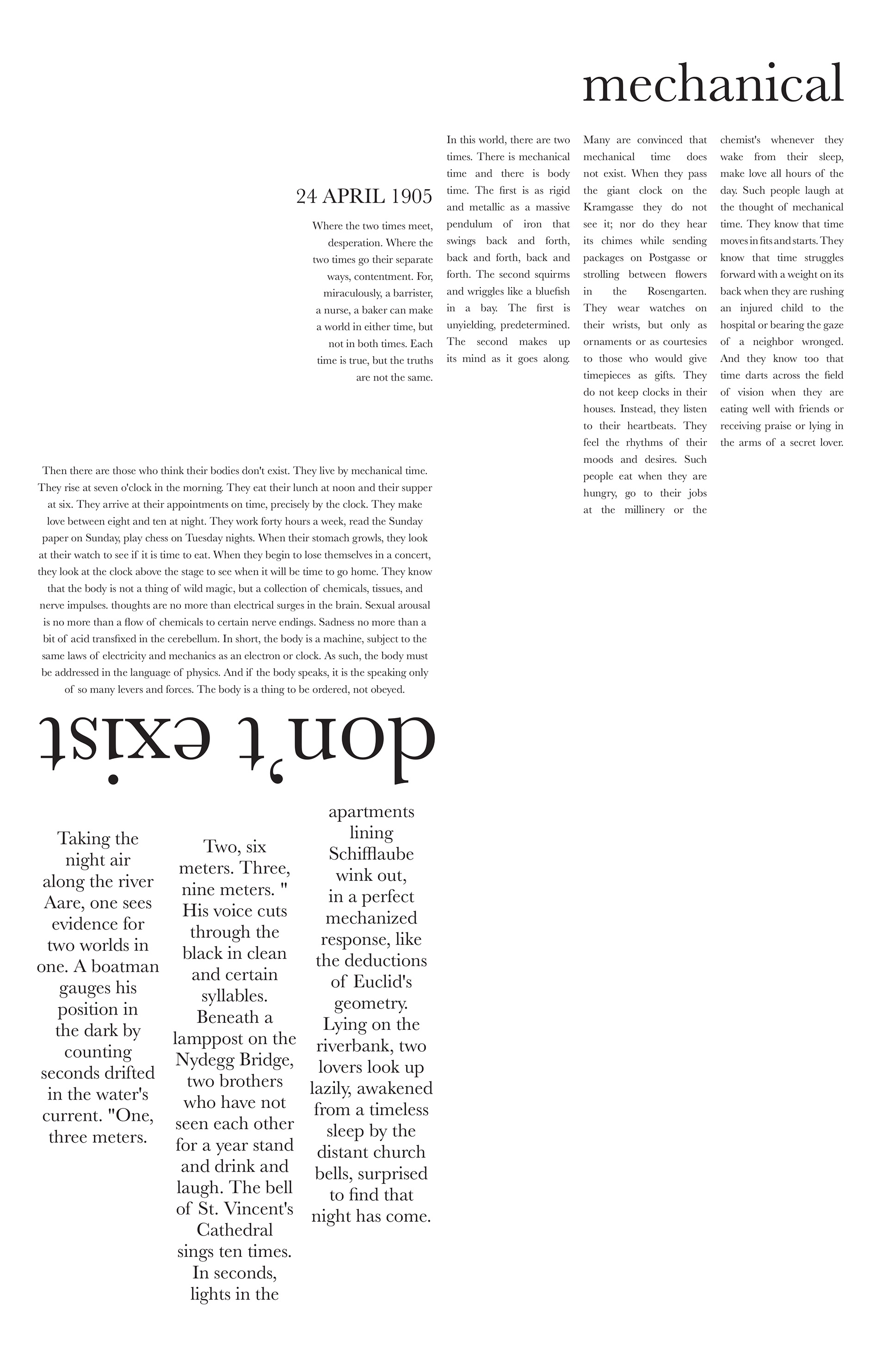 We took an excerpt out of Albert Einstein's Dreams and arranged the type in a manner that corresponds with the chapter.